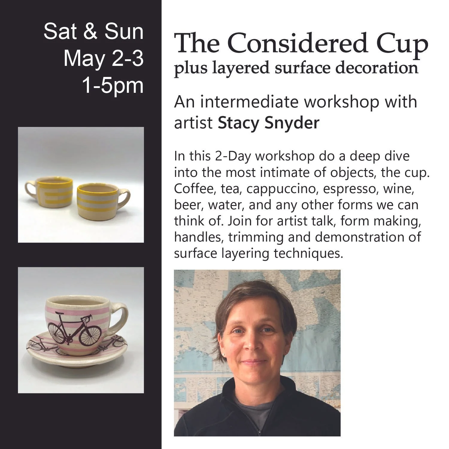 Day 1 includes artist talk and making the forms. Day 2 includes handles, trimming and demonstration of surface layering techniques including underglaze with masking, iron decals, low temperature glaze with masking, low temperature decals.