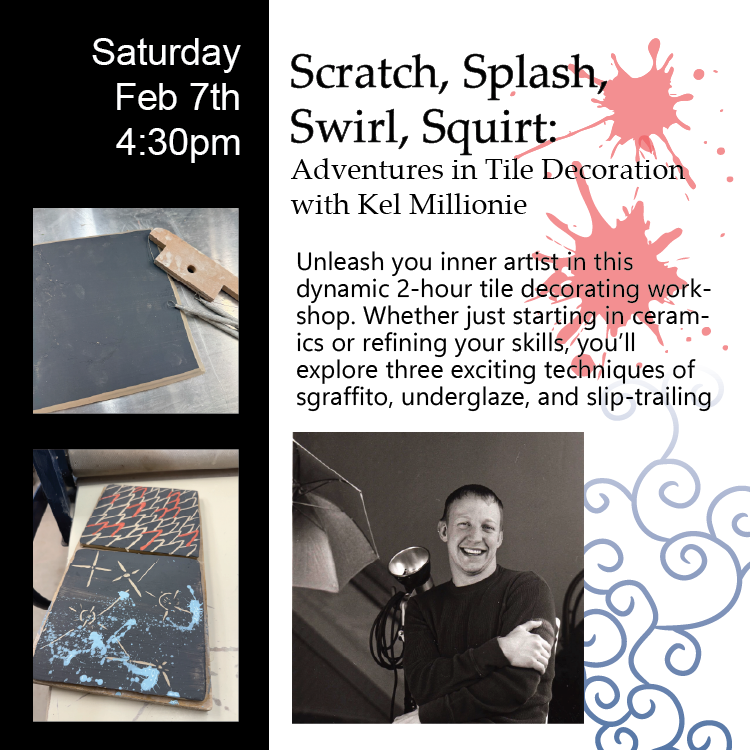 Unleash you inner artist in this dynamic 2-hour tile decorating workshop. Whether just starting in ceramics or refining your skills, you’ll explore three exciting techniques of sgraffito, the painterly possibilities of underglaze, and the elegant raised lines of slip-trailing. You’ll transform pre-made leather hard tiles into personalized works of art that can hang on a wall or used on a table. All materials provided. Tiles will be glazed and fired by our professional staff. Finished tiles will be ready for pick-up in 3-weeks.