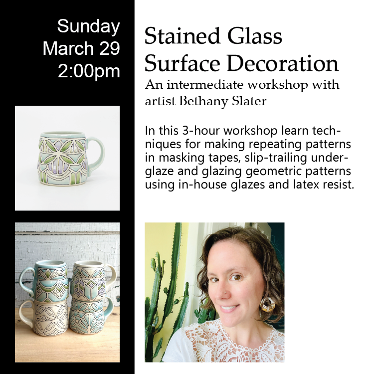 In this 3-hour workshop we will spend the first half of the workshop will be spent learning techniques for making repeating patterns with masking tape, as well as slip-trailing underglaze within the patterns to create depth. The second half of the workshop will be spent learning how to glaze the geometric patterns using multiple glazes and latex resist. Participants should come prepared with one or two pieces of bisqued pottery. It is highly encouraged to bring pieces that have been compressed or burnished with a metal or rubber rib at the end of trimming to ensure a smooth surface for the tape and slip-trailing.